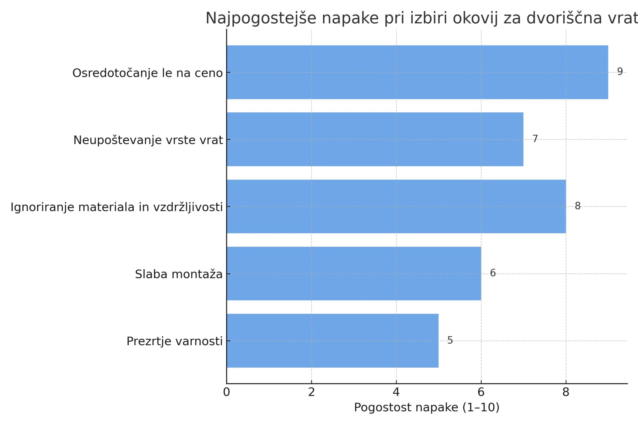 Lastniki pogosto izberejo okovja samo glede na ceno, ne upoštevajo pa nosilnosti, materiala ali vzdrževanja. Rezultat so škripajoča vrata, hitra obraba in stroški popravila.