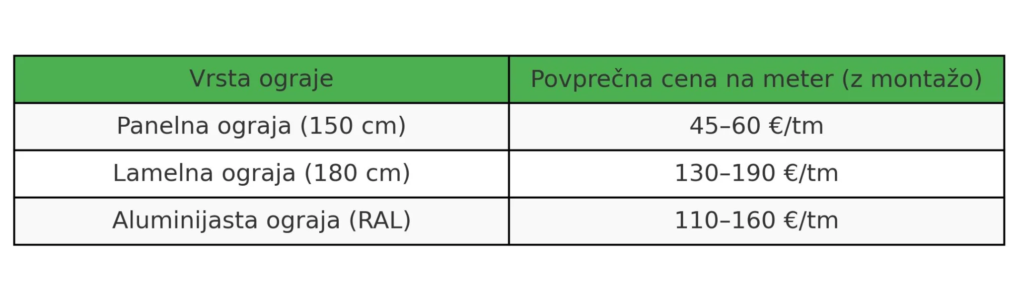 V letu 2025 se cene ograj gibljejo od 45 €/m za enostavne panelne ograje do tudi 200 €/m za prestižne lamelne sisteme z vrati in avtomatiko.