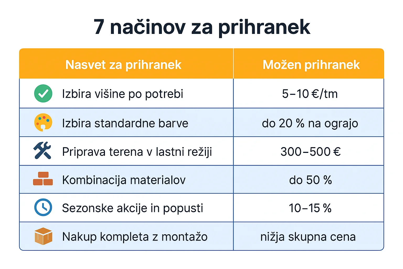 Pametna kombinacija materialov lahko občutno zmanjša stroške – npr. lamelna ograja ob cesti, drugod pa panelna ograja, kjer ni potrebe po zasebnosti.